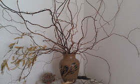 The last pic is a vase of dried curly willow branches that I picked up on about 150 dog walks from a house on the other side of the block. Every time we got a good wind, I'd walk the dog that way and collect some more fallen branches. So far, they're on the mantel, in this vase, in a pot by the front window, and sticking out of a vintage glass lampshade that you can just see behind the standing up spindles in image 5. Oh, and a pile out on the patio drying.